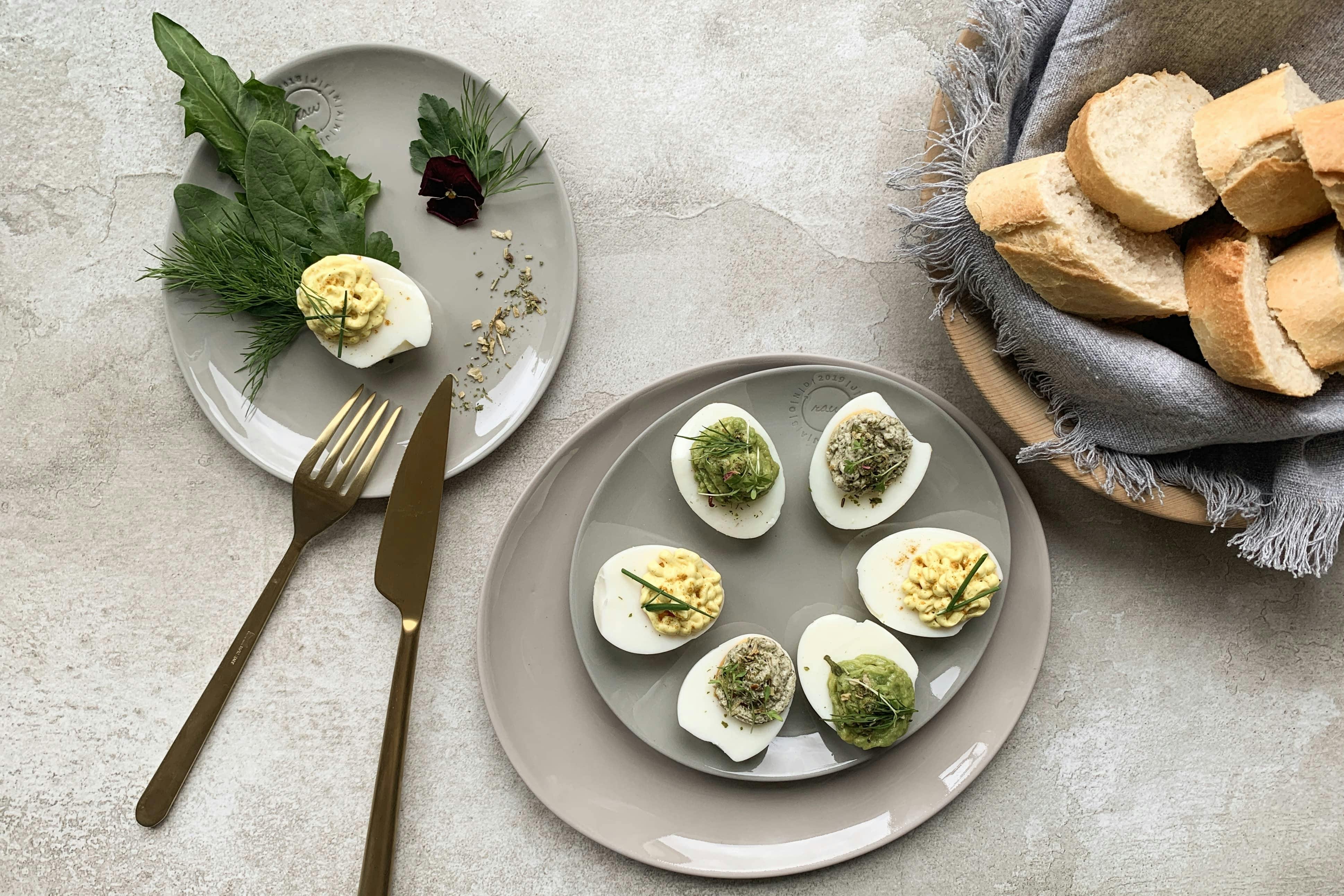 halbe gefüllte Eier mit dreierlei Cremes und mit Veggy Classic gewürzt