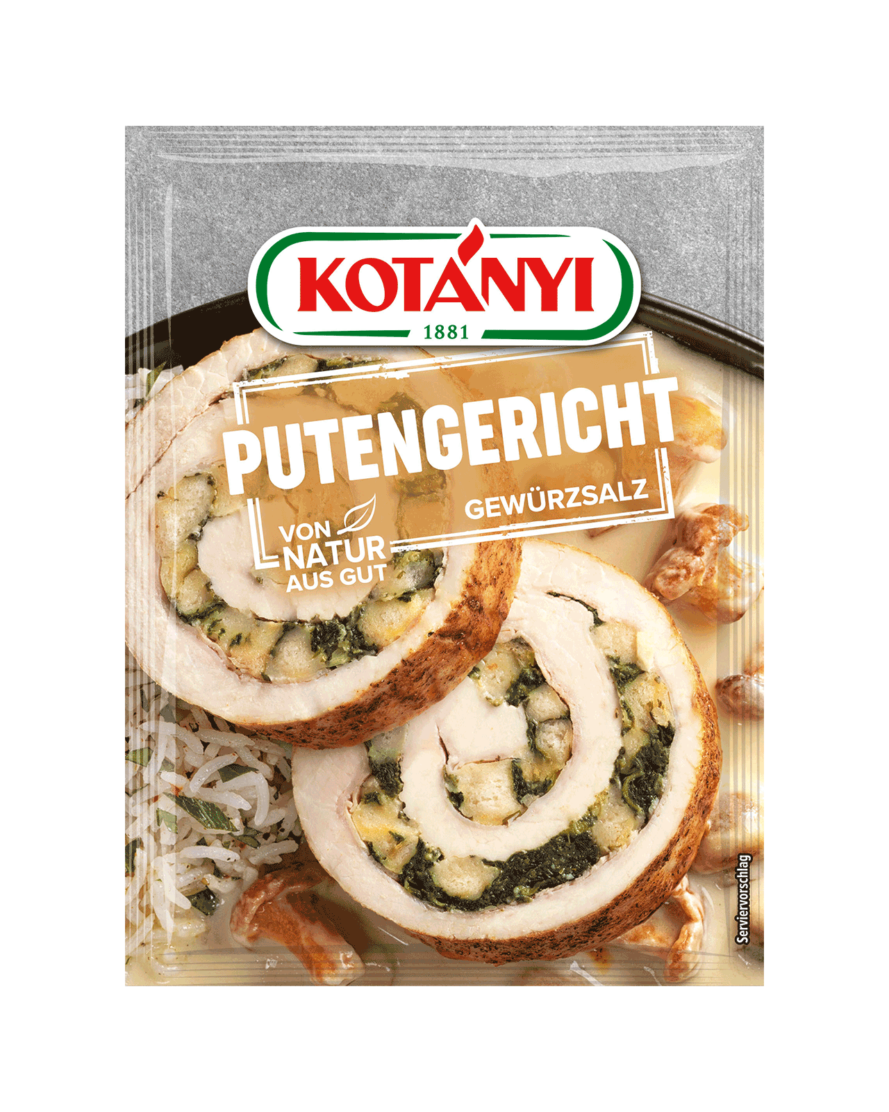 Erlesene Kräuter und Gewürze in einer fein abgestimmten Mischung – so wird jedes Putengericht erst zum wahren Genuss. Einfach Kotányi Gewürzsalz verwenden!