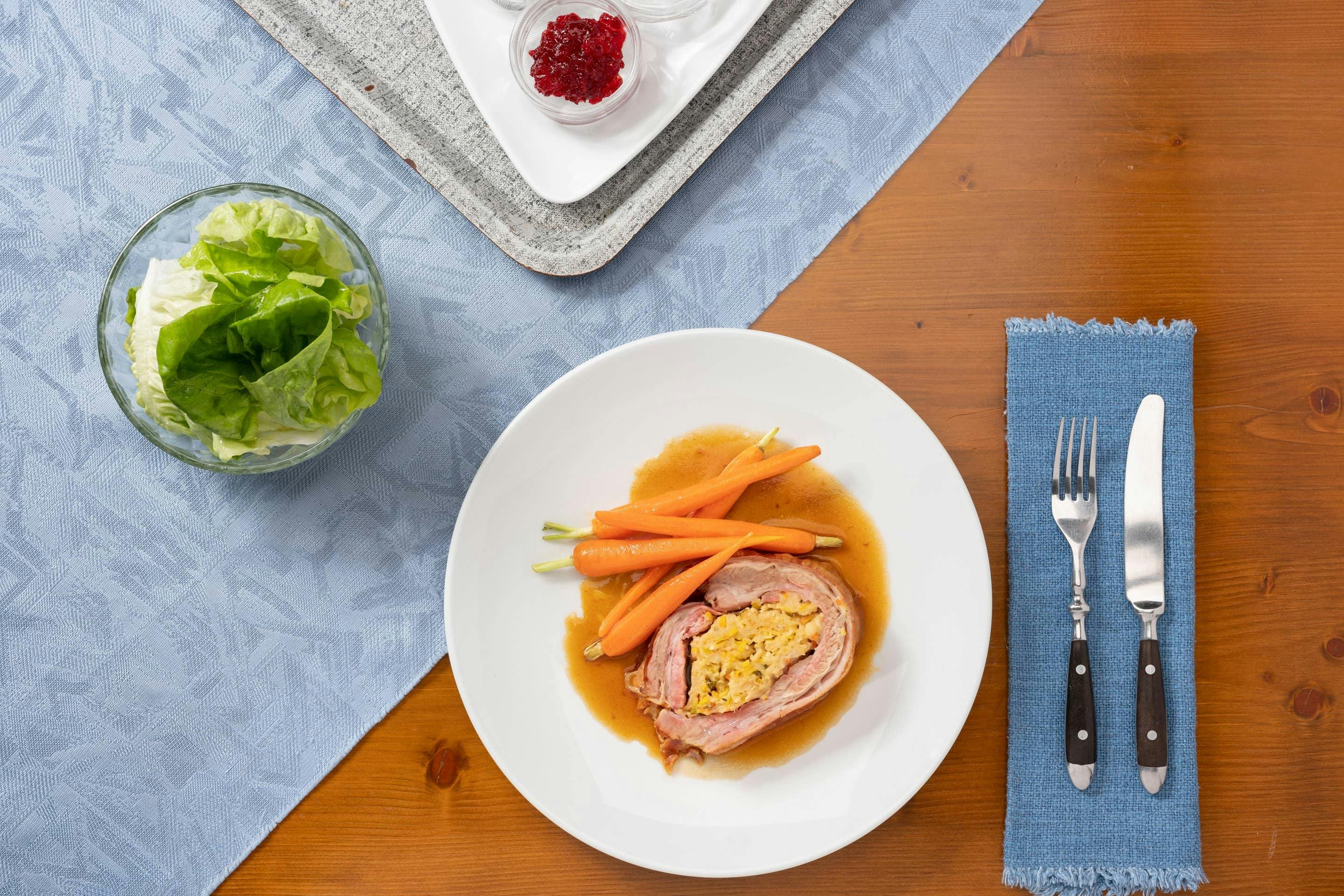 Für Tisch schneidet man die gefüllte Kalbsbrust in daumendicke Scheiben auf und umkränzt sie mit dem geseihten Bratensaft.