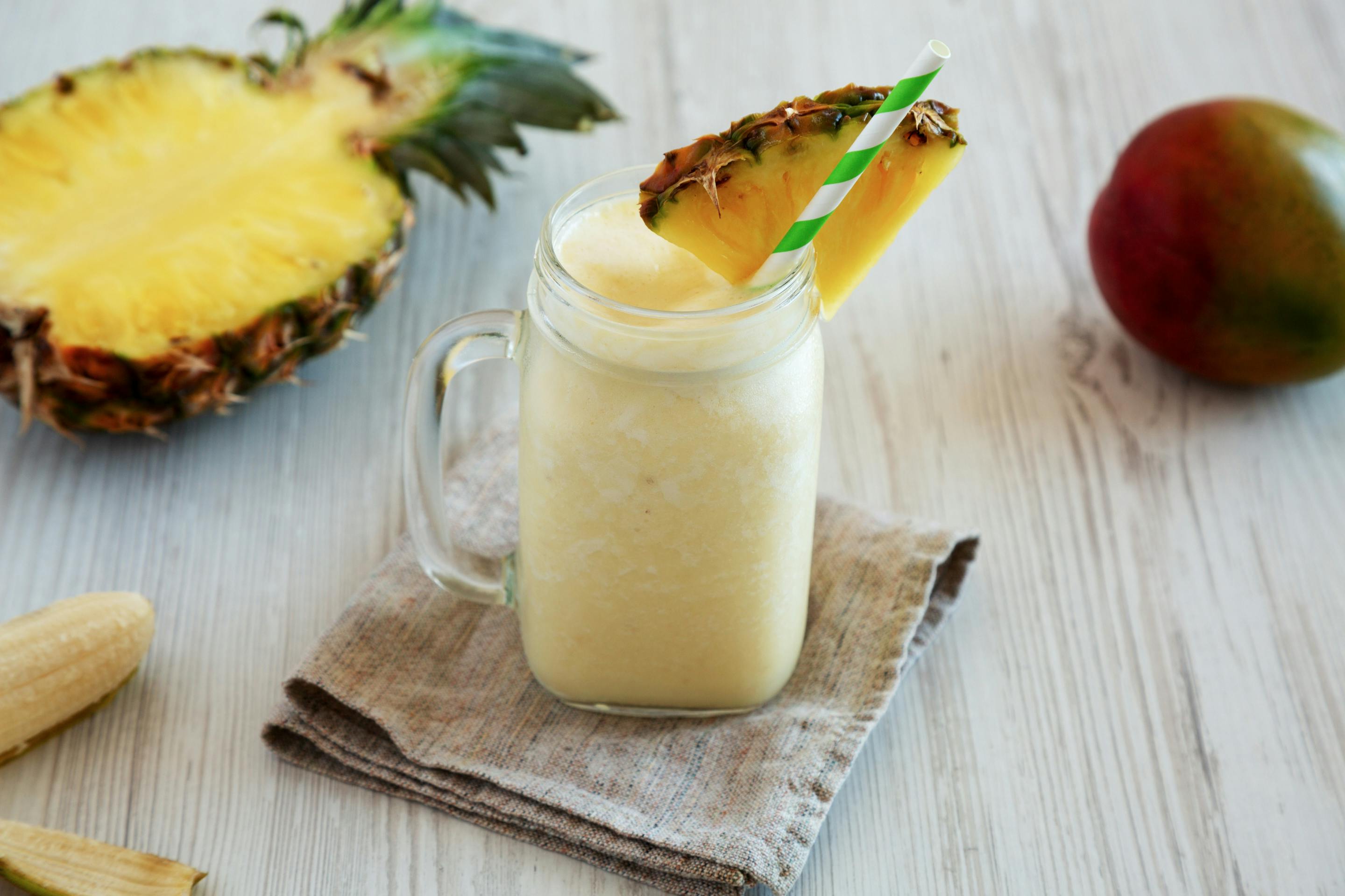 5—10 MinHier kommt alles rein, was nach Urlaub schmeckt: Bananen, Mango, Kokos und eiskalte Ananas. Fein gemixt entsteht daraus ein cremiger Drink, der auf Eis serviert wird. Gern garnieren wie in einer exotischen Strandbar!