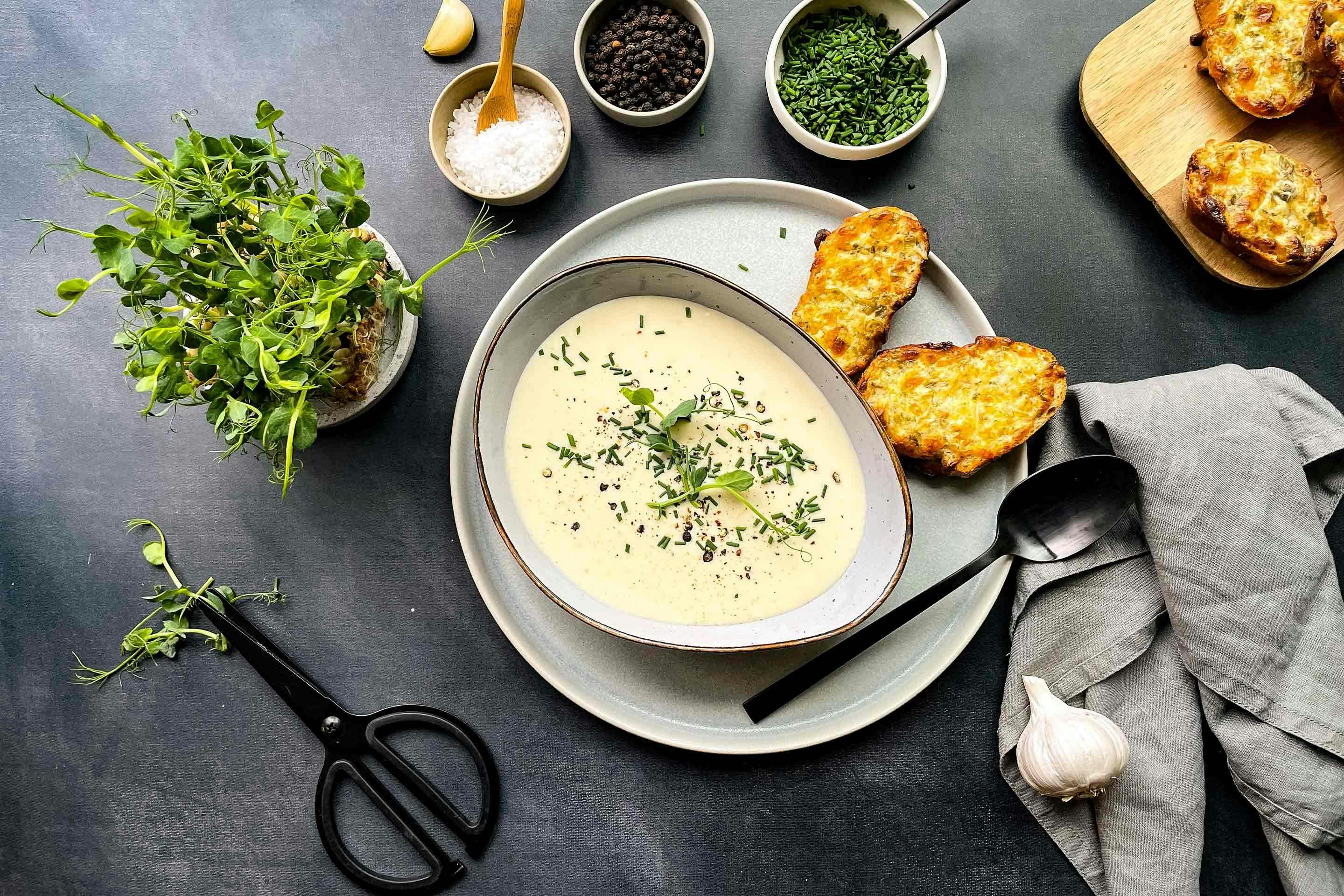 Knoblauchcremesuppe mit gratinierter Brotscheibe