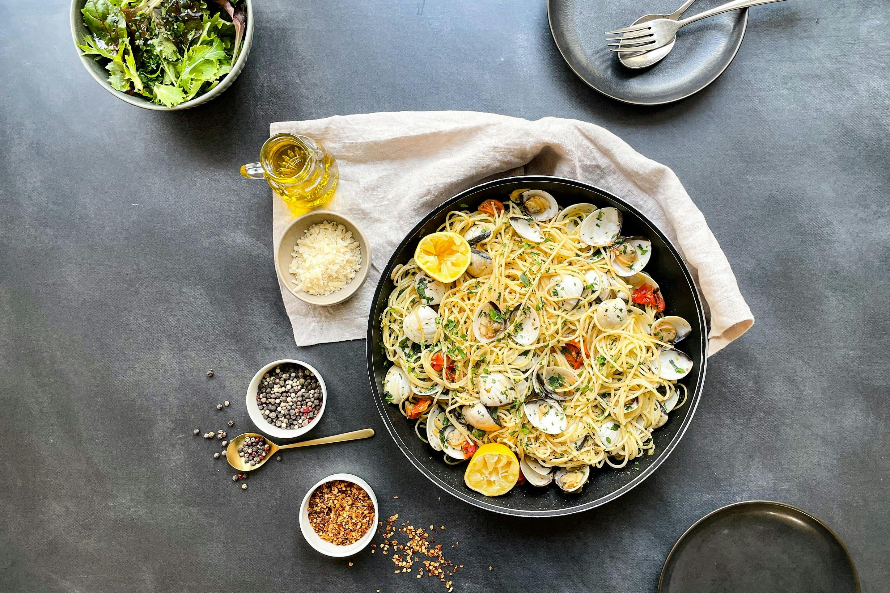 Petersilie fein hacken, die Zeste der Zitrone abreiben und gemeinsam mit den Spaghetti zu den Muscheln in die Pfanne geben. Alles gut miteinander vermischen und mit Salz und Pfeffer abschmecken.