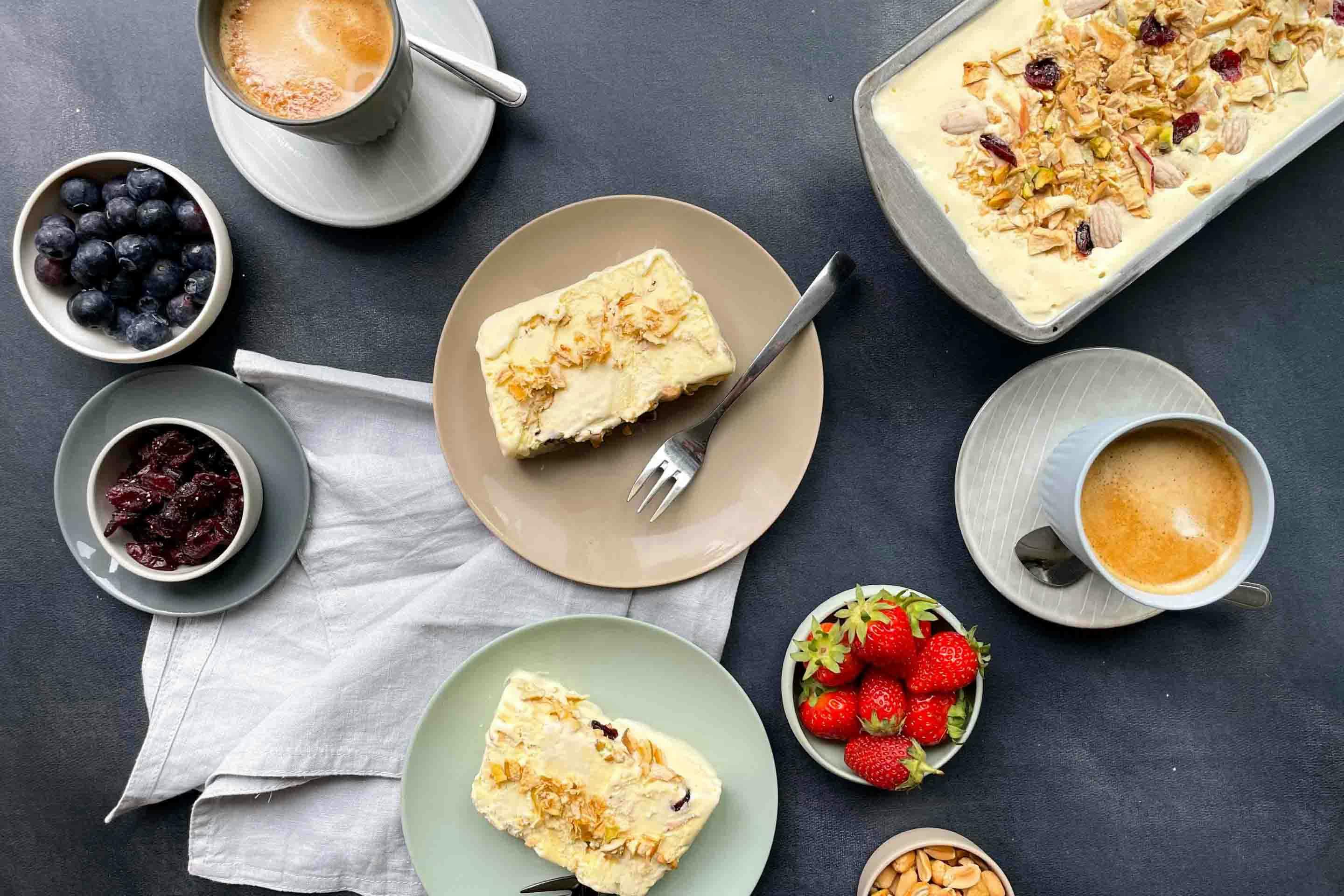 Für einige Stunden im Tiefkühlschrank fest werden lassen. Vor dem Servieren kurz antauen lassen um es leichter schneiden zu können.